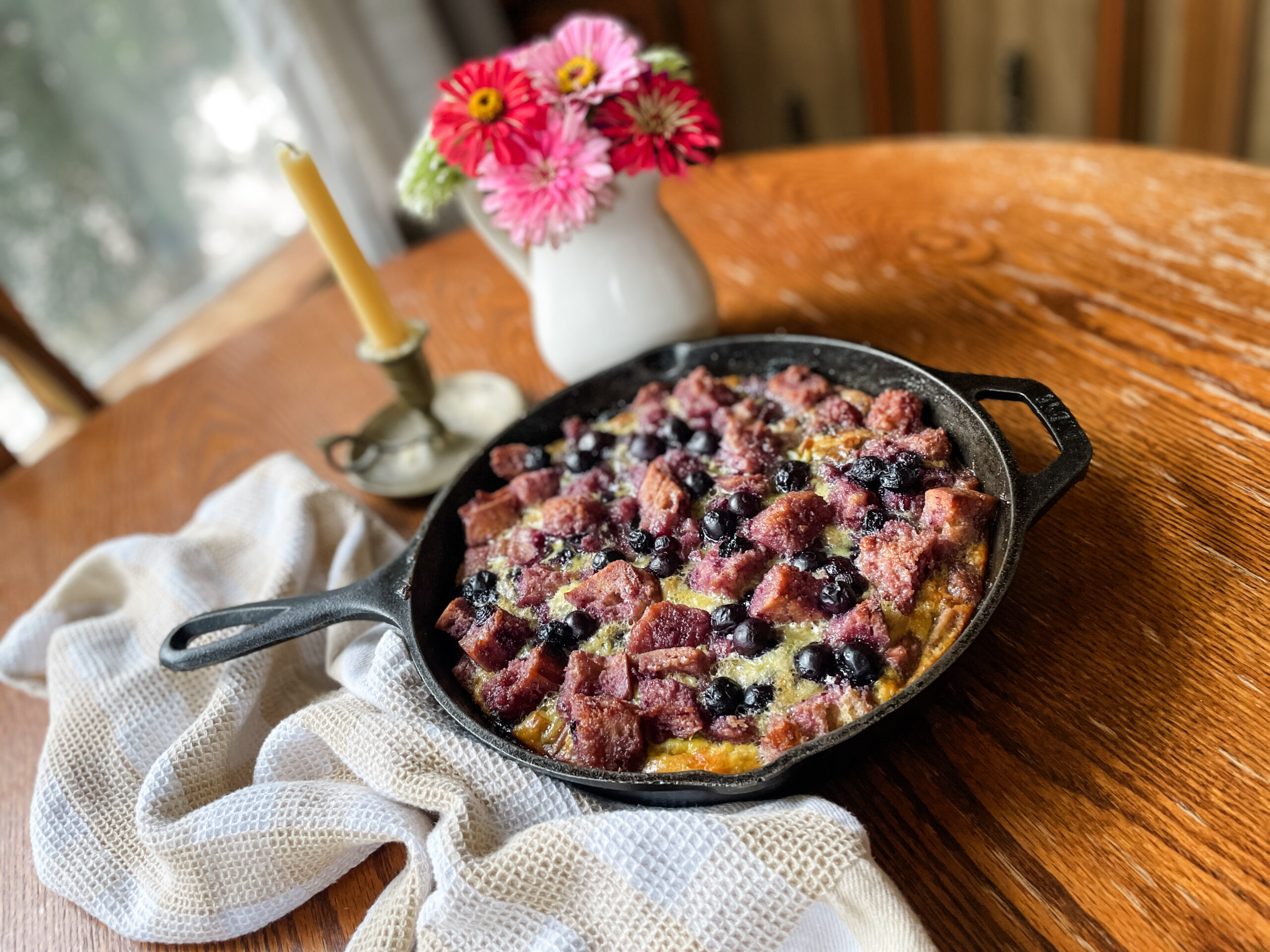 Another protein rich breakfast that has a lot of eggs is this blueberry breakfast bake. It is similar to a Dutch baby or sheet pan, pancake. It is full of eggs and milk with a little flour and some warm spices. You can add blueberries or apple slices or any fruit that you desire for a extra little touch. We love to serve it with maple syrup and butter.